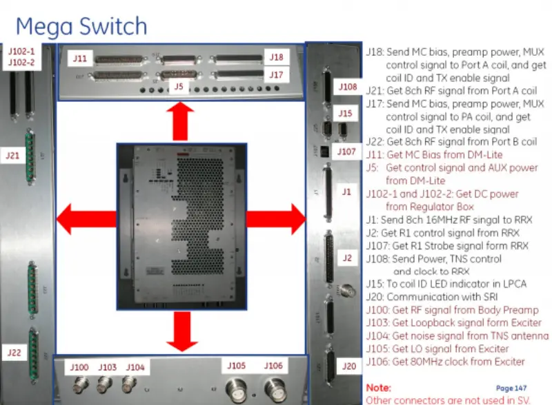 Communication SRI (J20) : permet l'échange de données avec les entrées de signal externe SRI (J100, J103-J106) : recevez des signaux RF du préampli corporel, des signaux de bouclage de l'excitateur, des signaux de bruit de l'antenne TNS, des signaux LO et une horloge 80 MHz de l'excitateur.